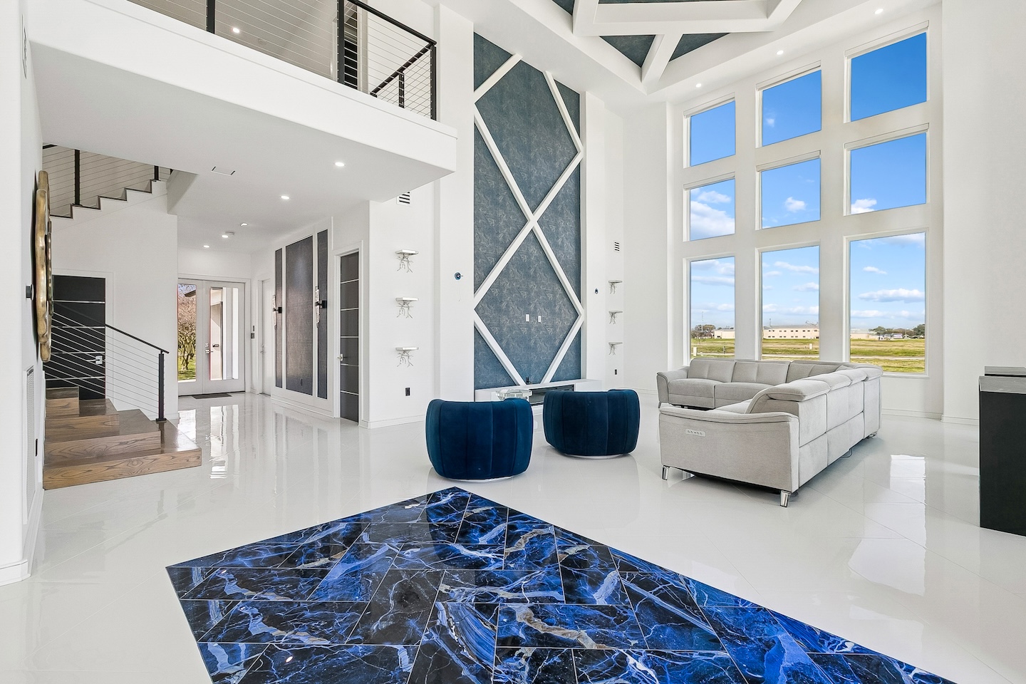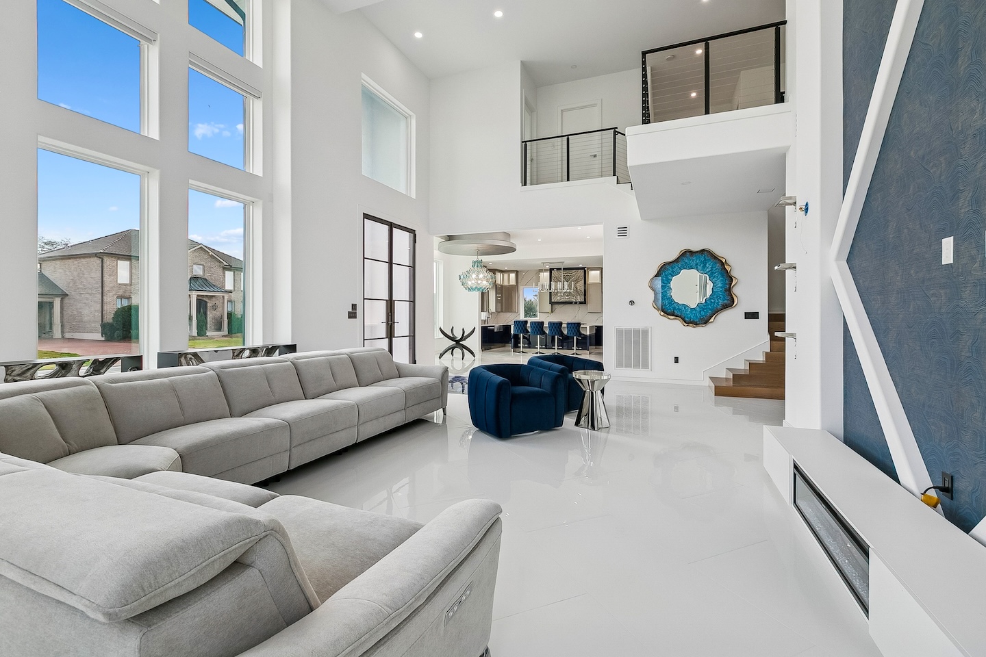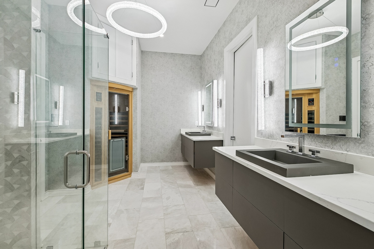 Modern features including 2 clear story window walls, ultra white smooth stucco & full length glass front doors Interior: Features modern wall designed with wallpaper infills, custom sheeted cabinetry and sauna. From remodeling to new construction, One Construction can deliver your personal living taste with the latest modern conveniences.